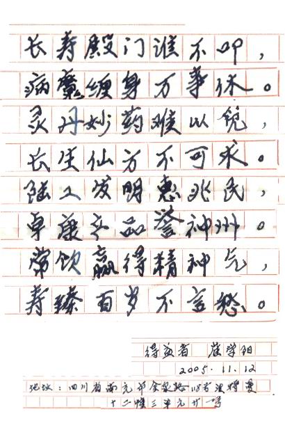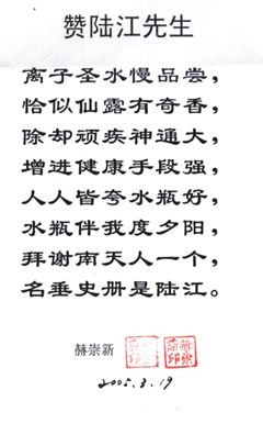凡尊重中國(guó)古代養(yǎng)生智慧的患者,堅(jiān)持“已饑方食”和定時(shí)主動(dòng)補(bǔ)水者,均可祛病康復(fù)。如牡丹江醫(yī)學(xué)院87歲的張鵬圖飲用半年后高血壓未痊愈,陸江與他通話(huà)交流,了解他原先每日主食4兩,建議他用“已饑方食”減少主食肉食量,他理解后,將每日主食減為3兩,少吃?xún)蓧K肉,飲用一年治愈26年的冠心病和高血壓。他2003年5月31日來(lái)信說(shuō):“飲用卓康小分子團(tuán)水是根治高血壓、冠心病、糖尿病的一把金鑰匙,是填補(bǔ)醫(yī)學(xué)空白,為人類(lèi)造福,應(yīng)推廣該產(chǎn)品。”
