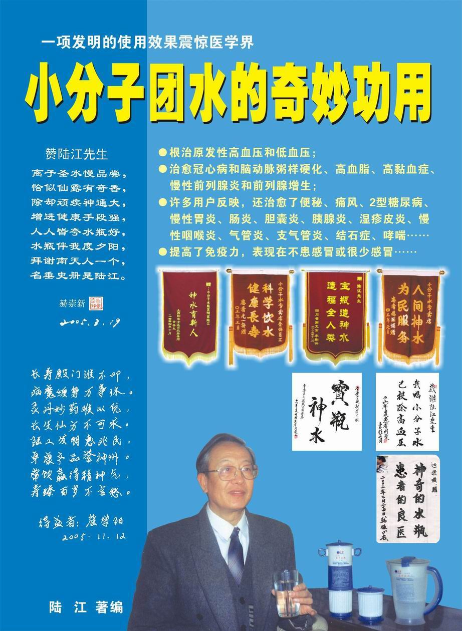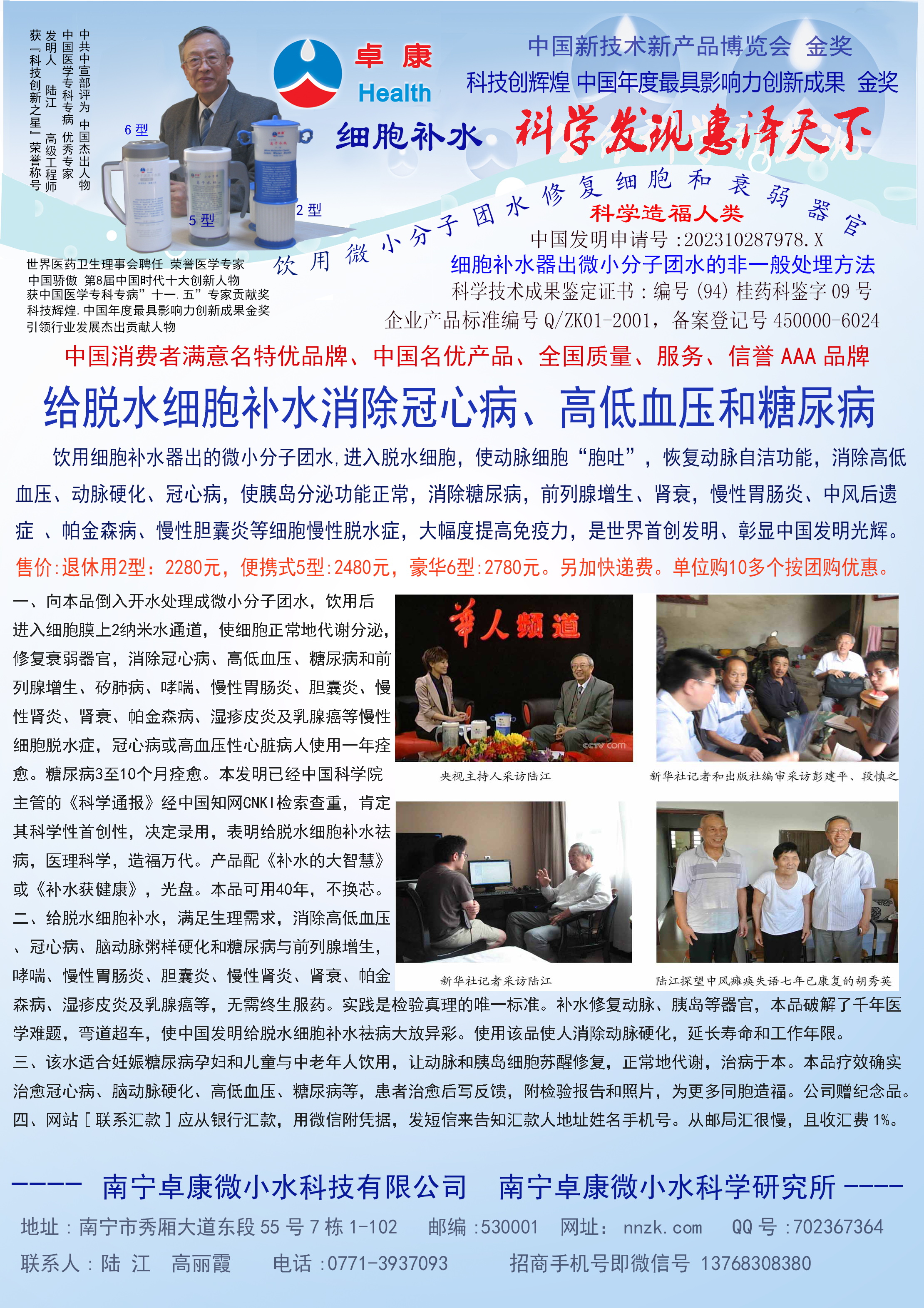 人類(lèi)幾千年來(lái)患以上病癥需終生服藥,幾十年也不能治愈。可是我國(guó)南寧的高級(jí)工程師陸 江,于1990年想根治高血壓,研究發(fā)明了離子水瓶,處理出微小分子團(tuán)水供飲用,經(jīng)過(guò)醫(yī)院臨床試用和專(zhuān)家鑒定,1999年獲中國(guó)發(fā)明專(zhuān)利權(quán),產(chǎn)品于2000年投放市場(chǎng)后一直跟蹤調(diào)查,據(jù)全國(guó)各地用戶(hù)反饋:祛除了高低血壓、糖尿病和冠心病,并使前列腺增生、咽喉炎、鼻竇炎、慢性氣管炎、支氣管炎、矽肺病、哮喘、慢性胃炎、腸炎、慢性膽囊炎、慢性腎炎、腎衰、膀胱炎、便秘、痔瘡、風(fēng)濕性關(guān)節(jié)炎和濕疹皮炎及中風(fēng)后遺癥等病癥不藥而愈。為什么喝微小水能治20多種?。筷?nbsp;江從1991年德國(guó)科學(xué)家發(fā)現(xiàn)細(xì)胞膜水通道僅為2納米獲得啟發(fā),認(rèn)為多種器官患病是因細(xì)胞脫水,不能正常代謝和分裂增殖,才使器官細(xì)胞減少致衰弱萎縮而形成細(xì)胞缺水性病癥。22年來(lái)的實(shí)踐有力地支持了“細(xì)胞脫水致病”這一重要論點(diǎn),表明喝微小水可滿(mǎn)足細(xì)胞的生理需求,補(bǔ)水就能祛病,是生命科學(xué)新亮點(diǎn)。